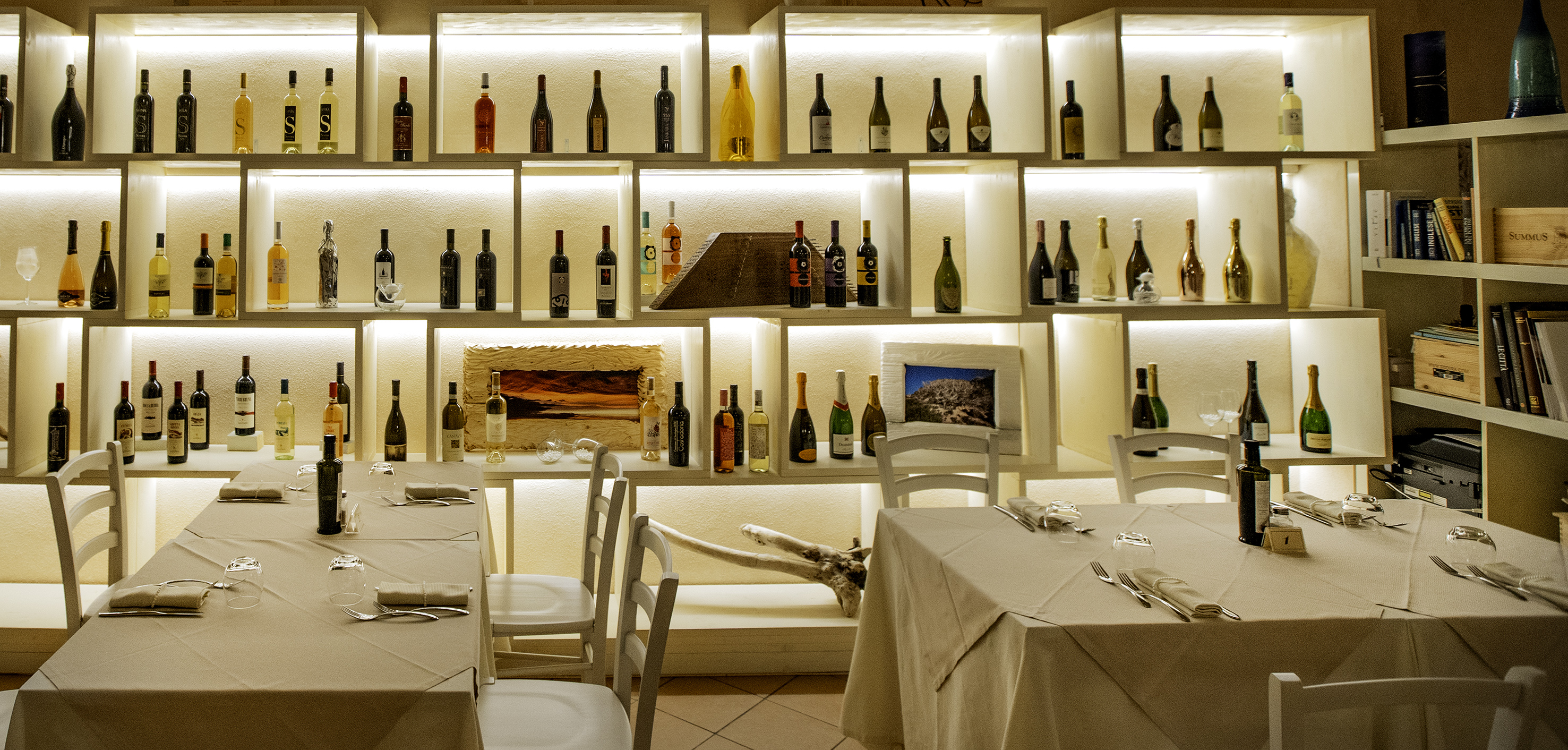 Luci morbide. Melodie scelte con cura che rimangono garbatamente di sottofondo. Colori caldi e rilassanti. Poco rumore. Tavoli ben distanziati. Lo sguardo che si perde nel verde del giardino e più in là nella macchia mediterranea che punteggia le rocce dalle mille sfumature rosate.